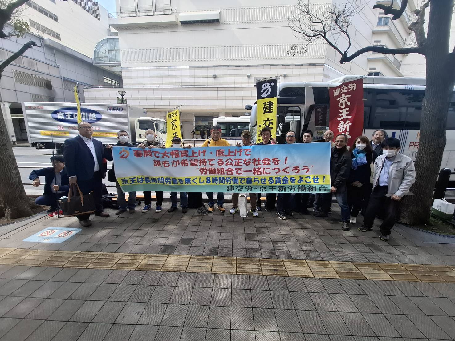 バス関連支部(京王新労組)は、2月18日に要求書を提出後、組合主張を行ってきたものの、会社の不誠実な回答を受けストライキに入りました。バス事業の原状は、運転手不足で路線の廃止や減便が続いており、京王バスでも同様です。物価高で実質賃金が目減りする中、ベースアップもなく、期末一時金支給だけでは日々の暮らしの改善にはつながりません。65歳までの定年延長が実施されることになりましたが年収が8割に減額されるため納得出来る回答ではありません。労働者あっての「事業」であるからこそ声を上げようと、春闘を広くアピールするため「見える化」を求めて京王電鉄本社前での「ストライキ集会」に取り組みました。オープニングを飾った「歌声の大熊氏」によるパフォーマンスの後、主催者挨拶で、内部留保を溜め込む企業に対し「物価高騰率を超える賃上げの声をあげよう」と呼びかけました。建交労中央本部、都本部、国民春闘共闘、東京春闘共闘、三多摩春闘共闘、郵政ユニオン委員長などが「物価高騰の中でストライキで賃上げを迫ろう、軍事費より生活保障へ、春闘を盛り上げよう」と表明がされました。この度の集会には、三多摩春闘共闘が大型バスを貸し切って行動を組み多くの仲間が激励に参加していただきました。今後、建交労からも多くの参加を期待します。集会後は三多摩春闘共闘会議の一員として仲間のスト集会に参加するなど、連帯して行動しました。