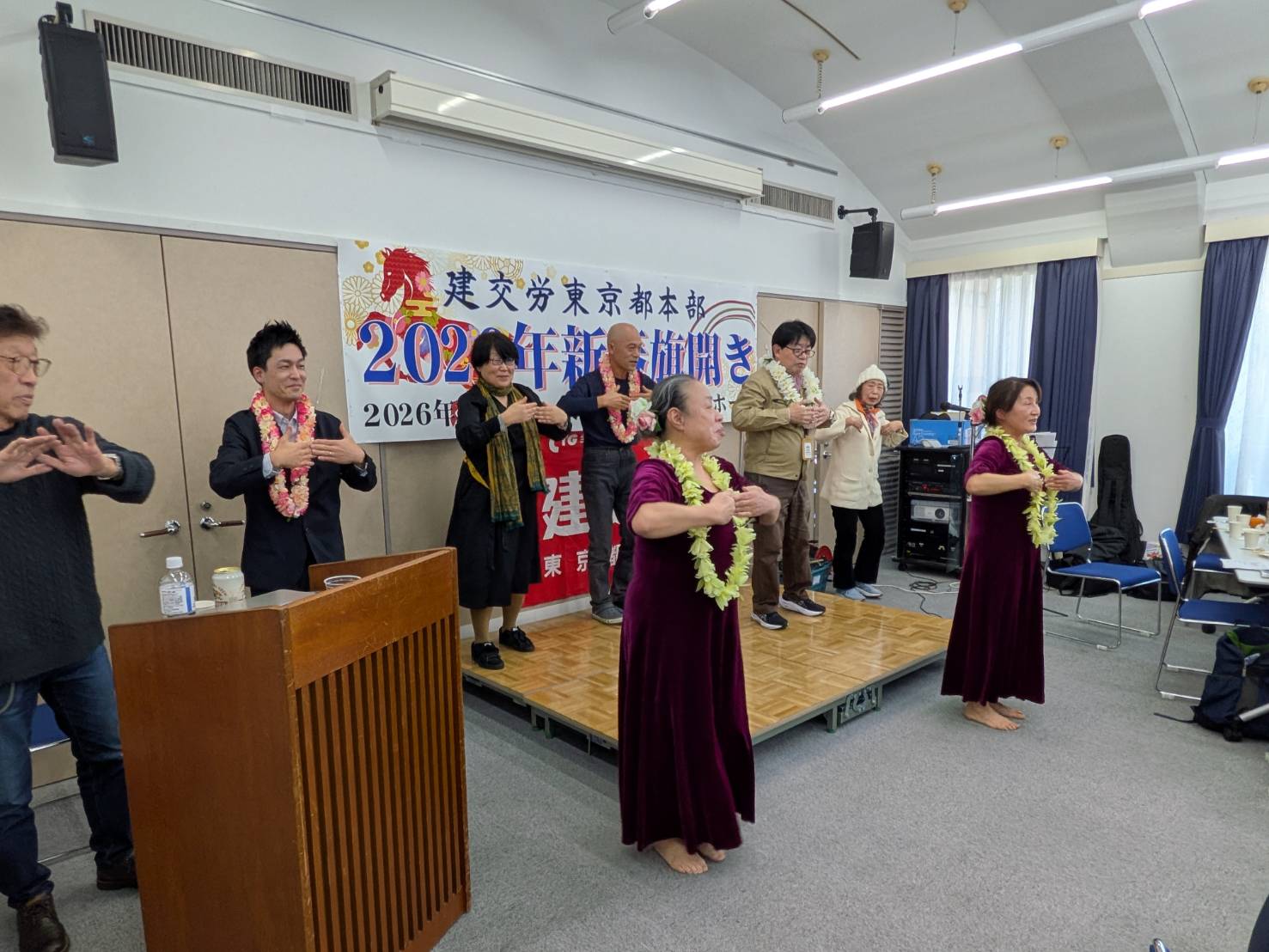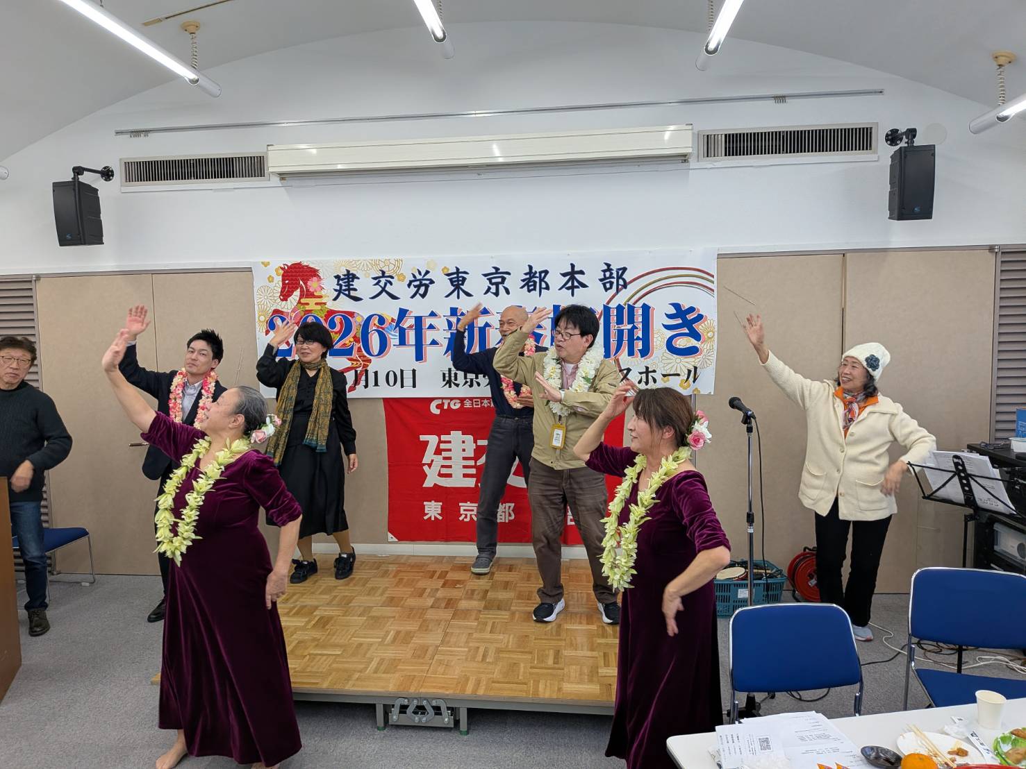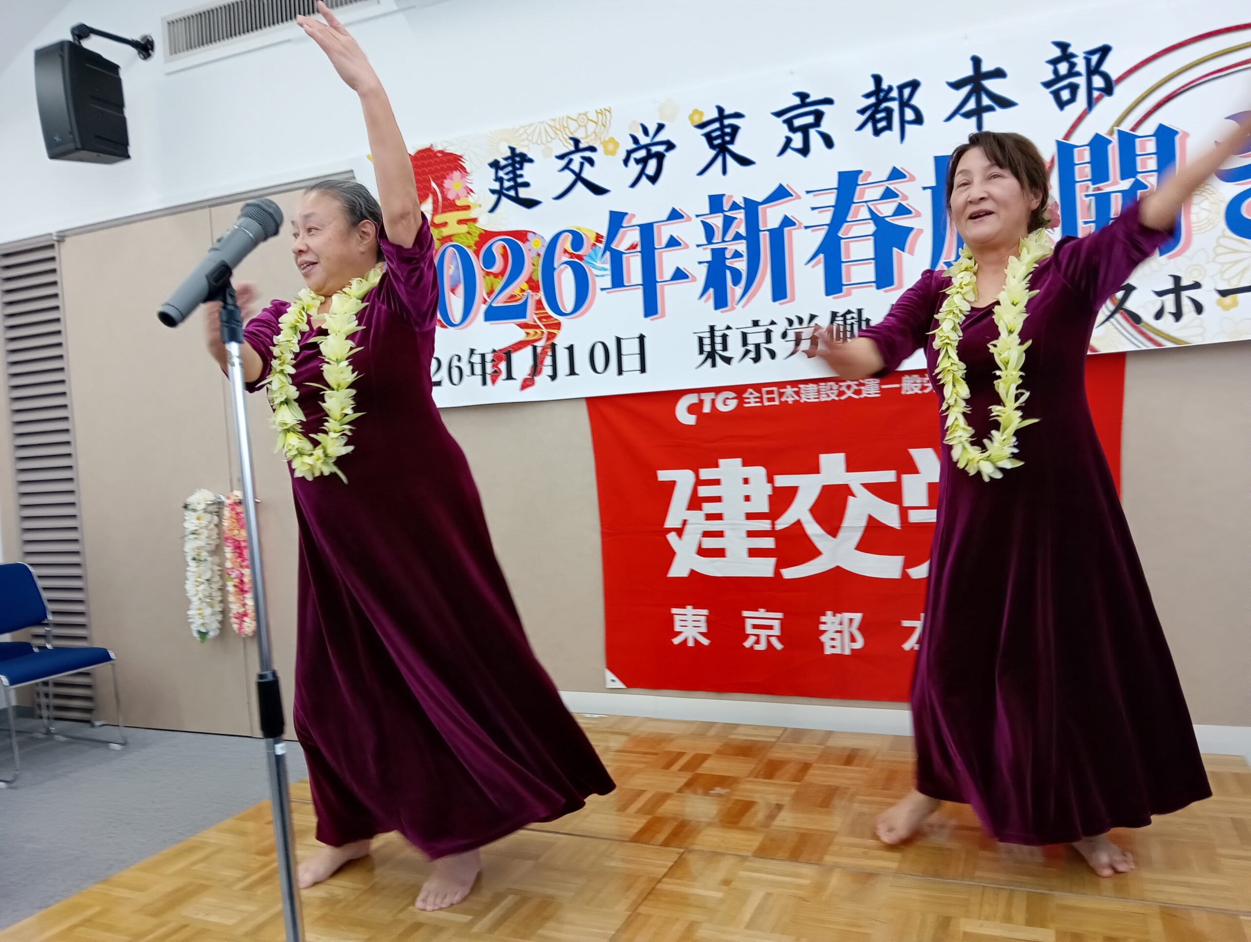 建設・関連部会の仲間が集う「わりかん歌う会」が今年もオープニングやフィナーレを盛り上げ、三多摩支部八王子学童保育分会の小池享子さんと清水裕美によるフラダンスパフォーマンスで会場全体があたたかい雰囲気に包まれ、気分は常夏ハワイに!