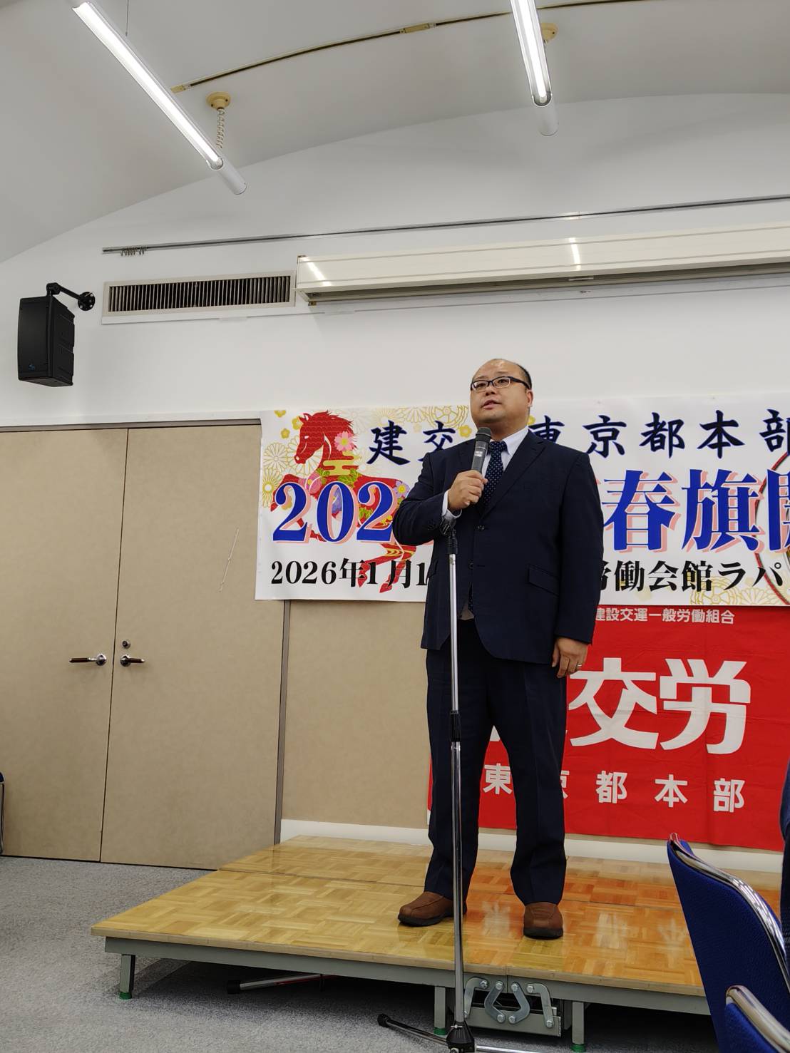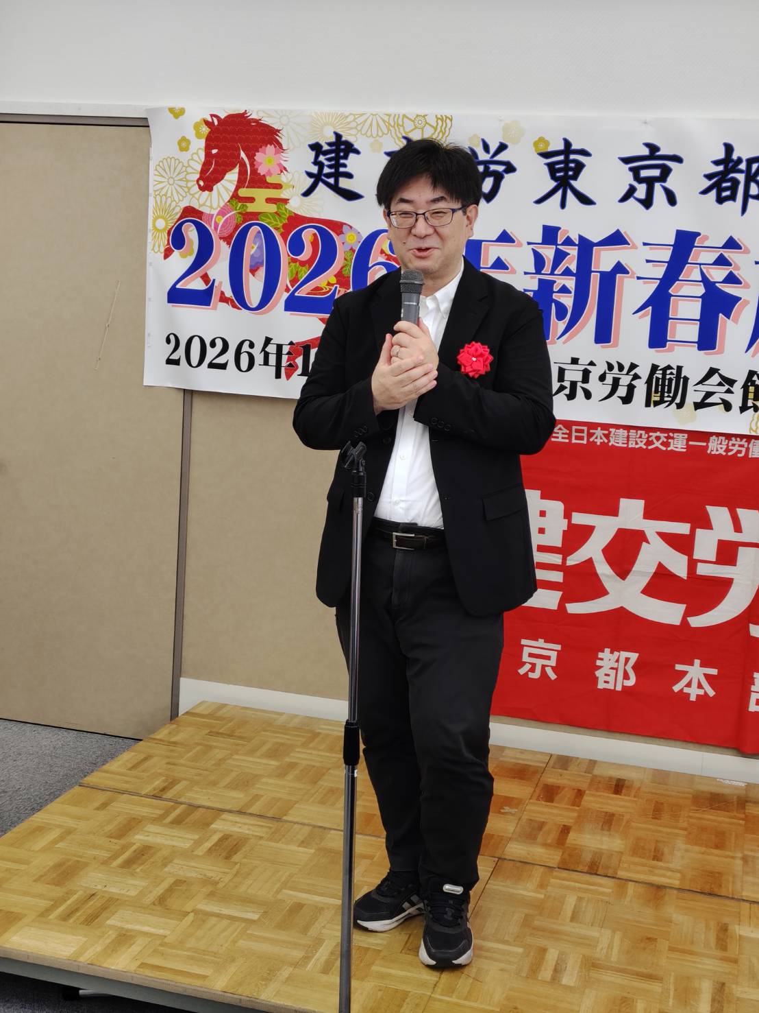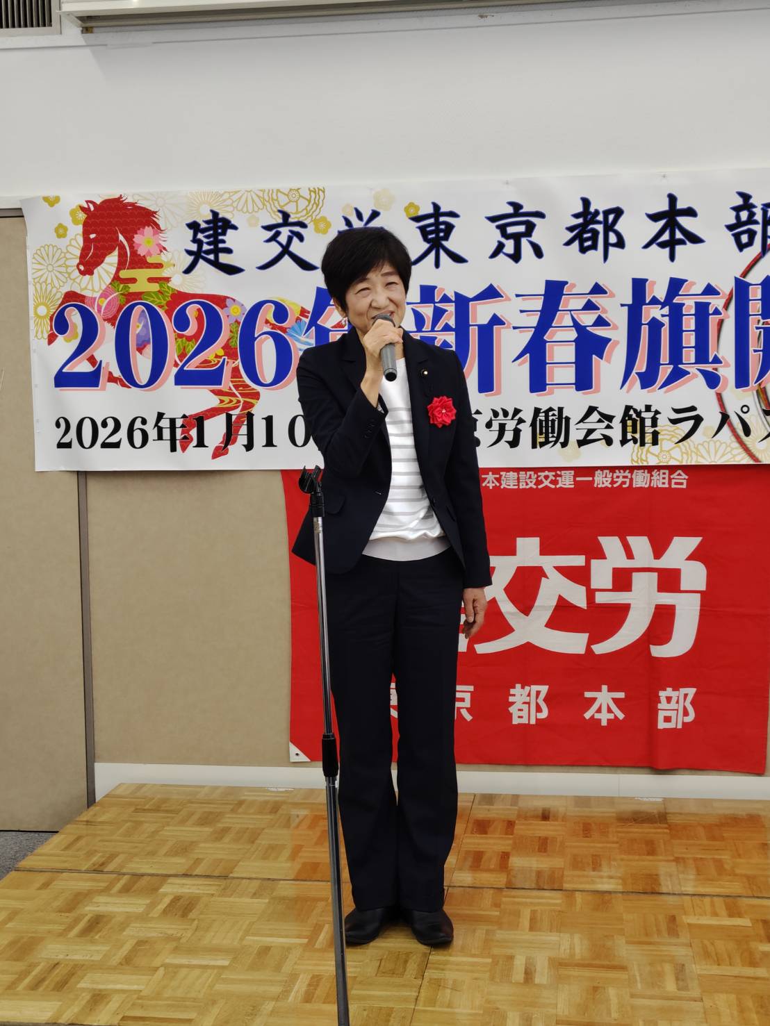 今年は、平和を願う労働組合の仲間の団結で政治闘争への取り組み、そして、何よりも物価高騰を上回る大幅賃上げを獲得し、働く人が豊に、幸せになる社会をみんなで実現しようではありませんか。1月10日(土)の旗びらきには組織内外から多くの仲間が参加し、26春闘勝利に向けた士気を高め合いました。来賓に東京地評井澤智事務局長、顧問弁護士の笹山尚人弁護士(東京法律事務所)、前衆議院議員宮本徹さん、日本共産党田中とも子都議会議員、建設政策研究所市村昌利専務理事、建設首都圏共闘会議上間正央事務局長、首都圏交運共闘会議林悦夫事務局長、建交労中央本部福富保名書記次長にご挨拶いただきました。お忙しい中ありがとうございました。