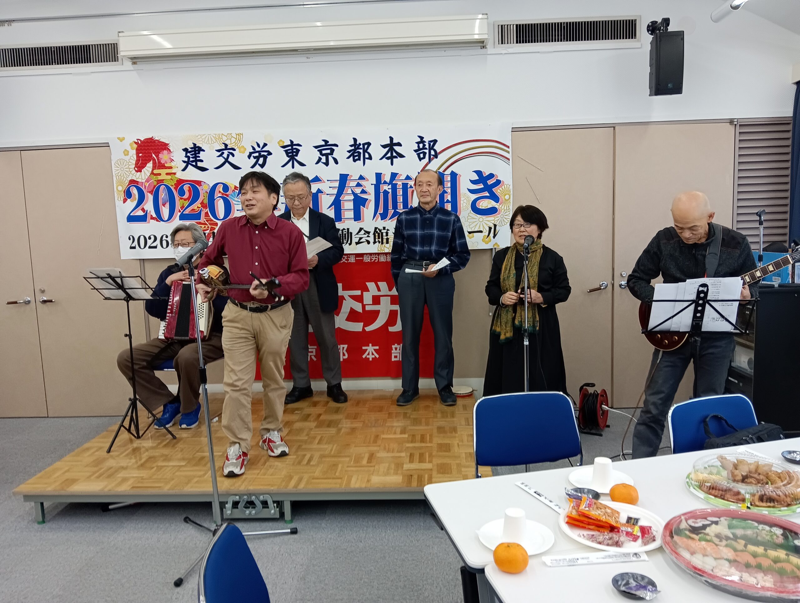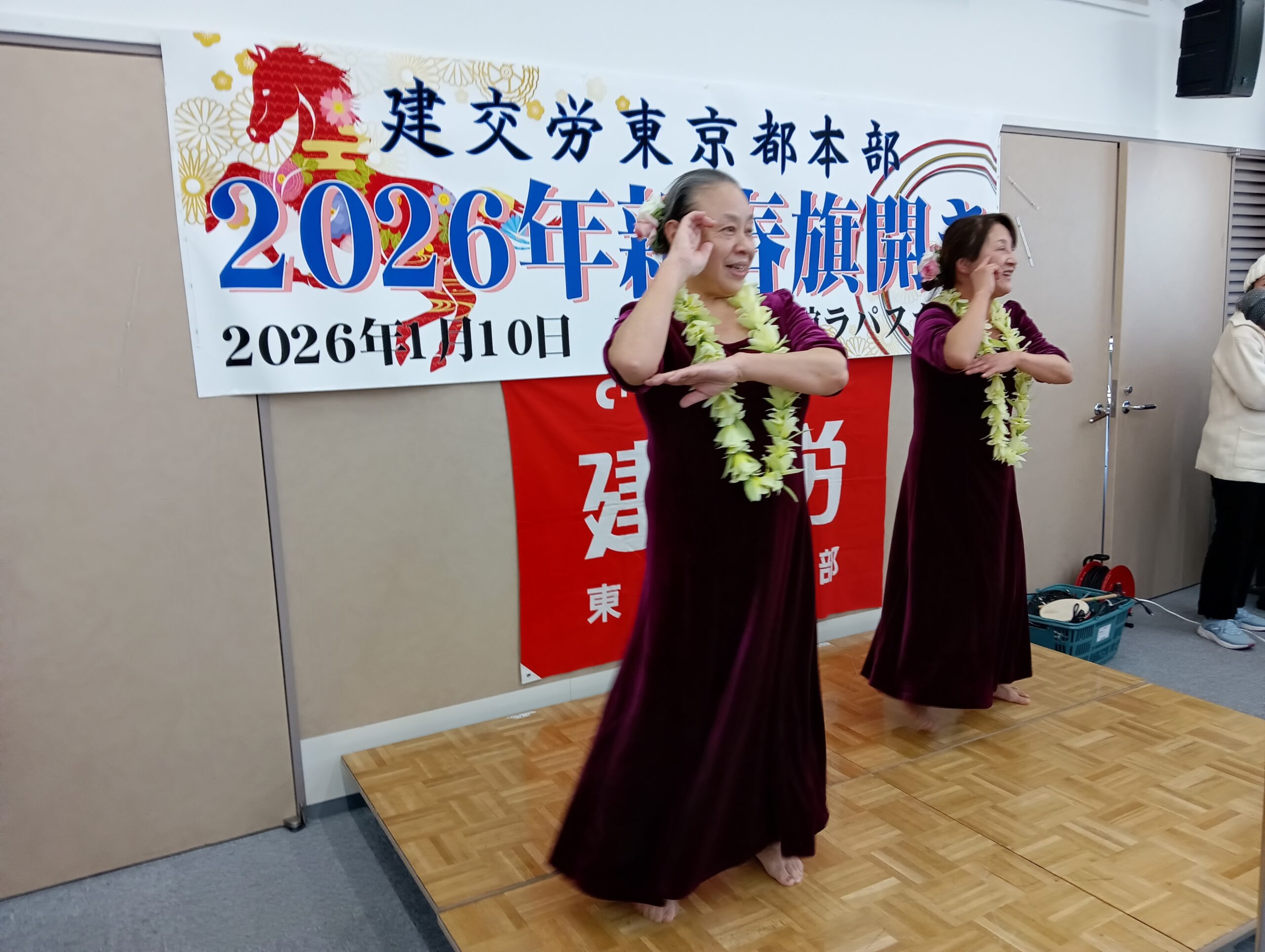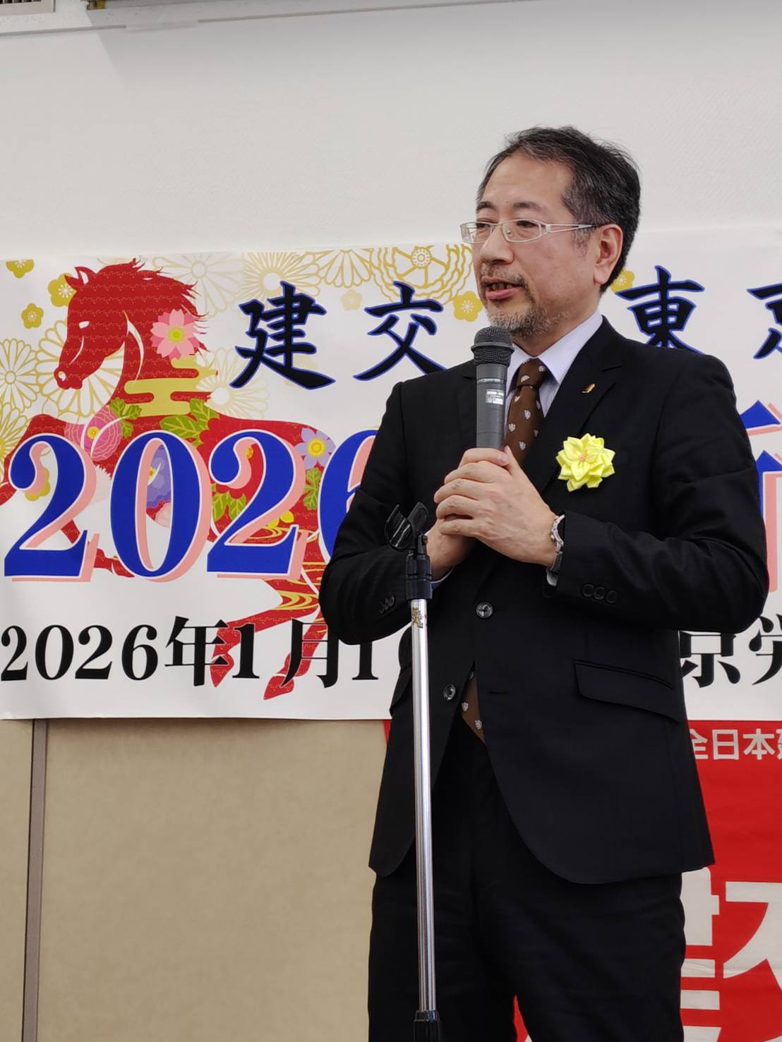 今年は、平和を願う労働組合の仲間の団結で政治闘争への取り組み、そして、何よりも物価高騰を上回る大幅賃上げを獲得し、働く人が豊に、幸せになる社会をみんなで実現しようではありませんか。1月10日(土)の旗びらきには組織内外から多くの仲間が参加し、26春闘勝利に向けた士気を高め合いました。来賓に東京地評井澤智事務局長、顧問弁護士の笹山尚人弁護士(東京法律事務所)、前衆議院議員宮本徹さん、日本共産党田中とも子都議会議員、建設政策研究所市村昌利専務理事、建設首都圏共闘会議上間正央事務局長、首都圏交運共闘会議林悦夫事務局長、建交労中央本部福富保名書記次長にご挨拶いただきました。お忙しい中ありがとうございました。